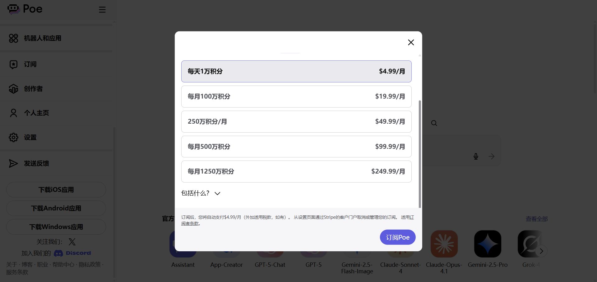 商品名称:Poe账号或会员订阅(官方,ChatGPT、Claude、Luma等、高度定制化机器人)